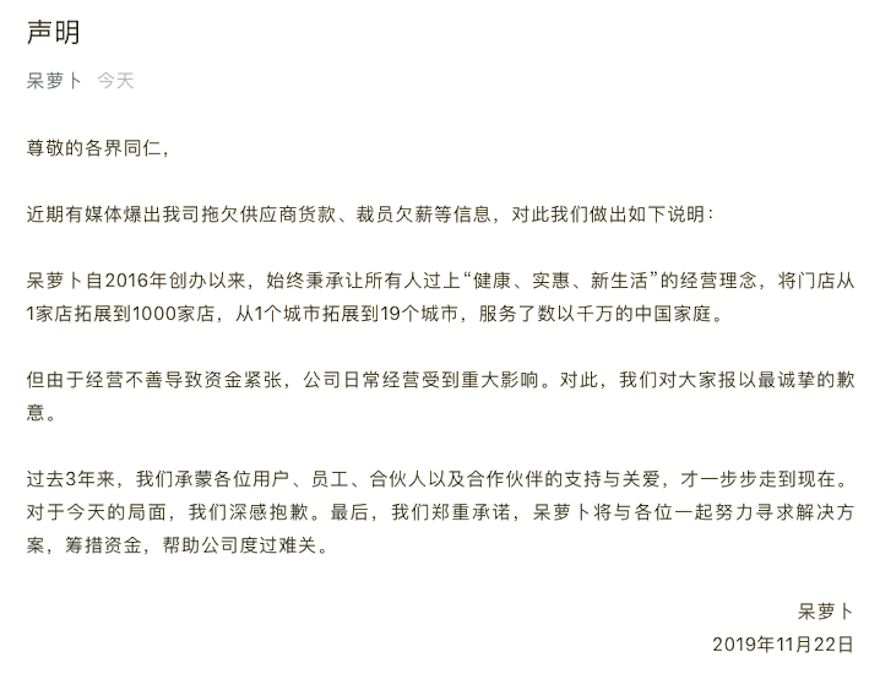 呆萝卜官方微信发布声明称:由于经营不善导致资金紧张,公司日常经营受到重大影响。对此,我们对大家报以最诚挚的歉意。