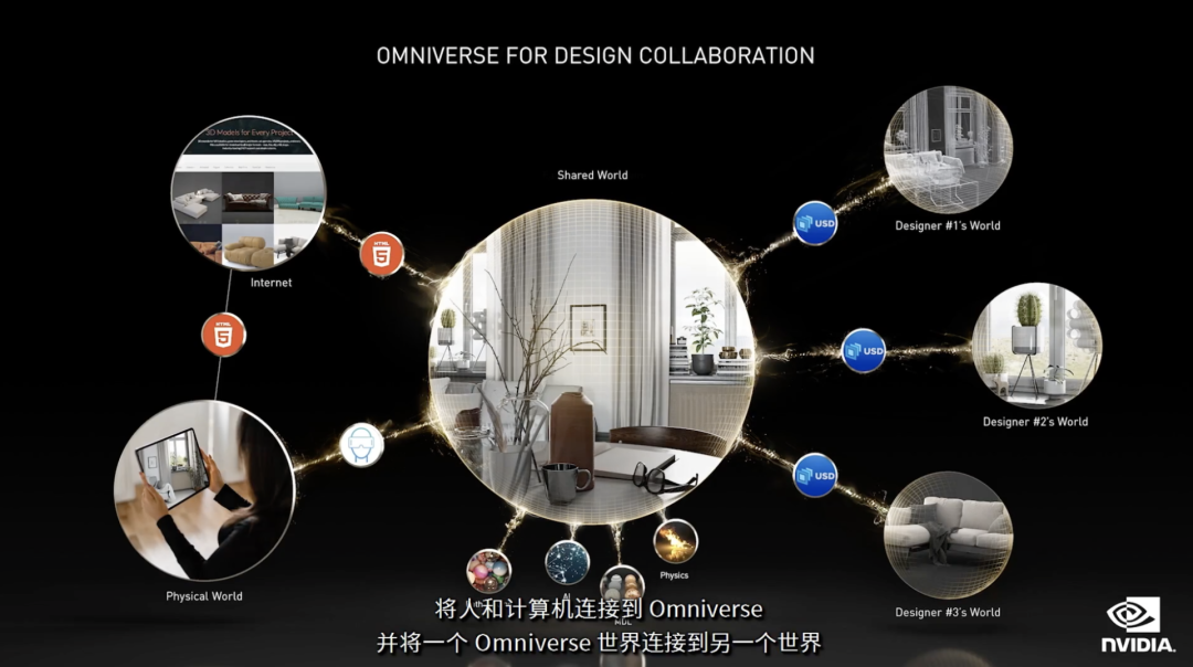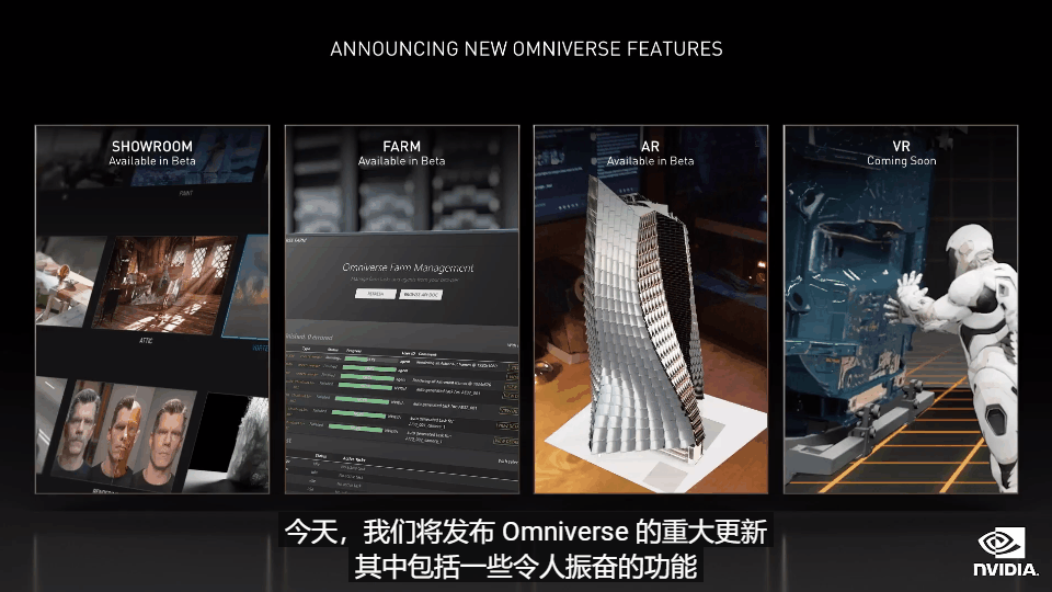 Omniverse AR可以将将图形串流到手机或者AR眼镜。Omniverse VR是英伟达首款全帧交互式光线追踪VR。