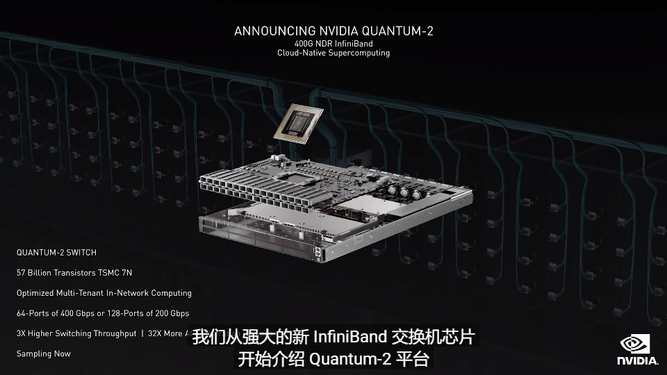 Quantum-2平台的核心是新的Quantum-2 InfiniBand交换机。它搭载570亿个晶体管,比拥有540亿个晶体管的NVIDIA A100 GPU略大。