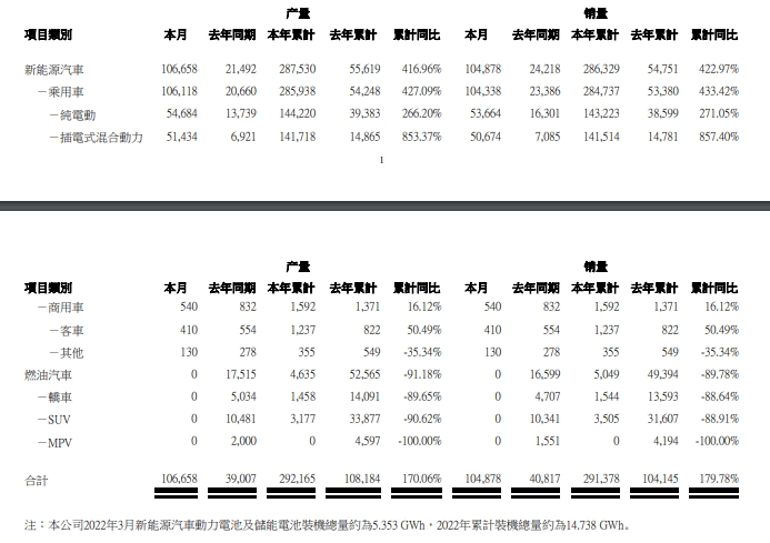 4月3日晚间,比亚迪在港交所公布了3月产销快报。今年3月,公司新能源汽车产量为106658辆,同比增长416.96%;销量为104878辆,同比增长422.97%。这是比亚迪发展史上首次月产销量双双突破10万辆。