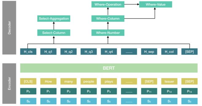 为了让自然语言问句与表结构更好地结合,模型将自然语言问句与列名一并作为输入进行编码。同时,模型在拼接输入时采用了不同的 Segmentation Embedding 来让 BERT 可以区分问题和列名。