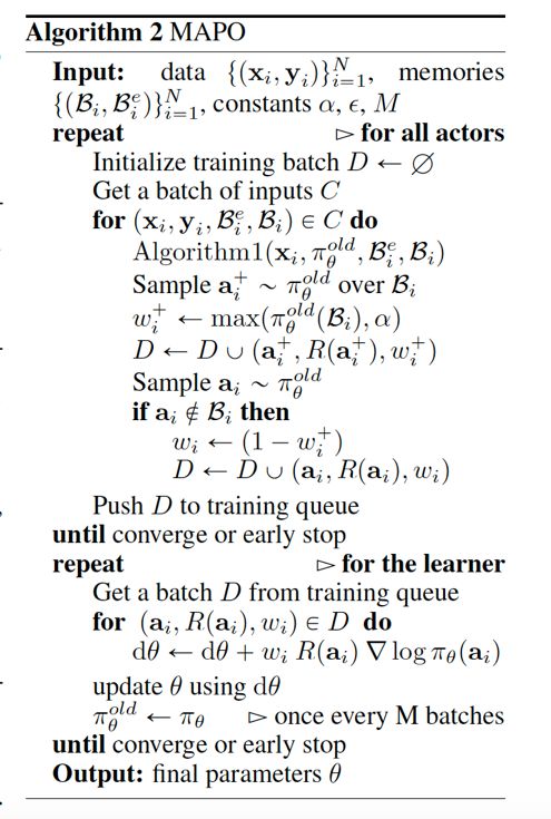 MAPO 算法是在论文 Memory Augmented Policy Optimization for Program Synthesis and Semantic Parsing 中提出的,发表于 2018 年的 NIPS 会议。论文中对 MAPO 算法的设计思路进行了详细的介绍,并且对 MAPO 算法在 WikiSQL 上的应用进行了详尽的分析。