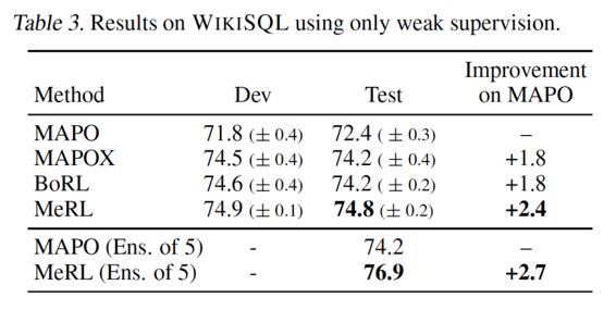 作者将 MAPO 应用到了 WikiSQL 数据集上,对于 WikiSQL 数据及上的每一个样本,都产生 1000 个采样程序,Memory Buffer 中储存 5 个高回报样本,在策略函数拟合网络中应用 GloVe embeddings,LSTM 隐藏单元为 200 个,训练 15000 步。