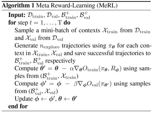 其中,R 为 underspecified rewards,f 表示样本级特征函数,Φ 是权重。这个权重是很难通过人工的方式进行调参的,因此解决方案是对其进行训练,训练的方式就是 MeRL。