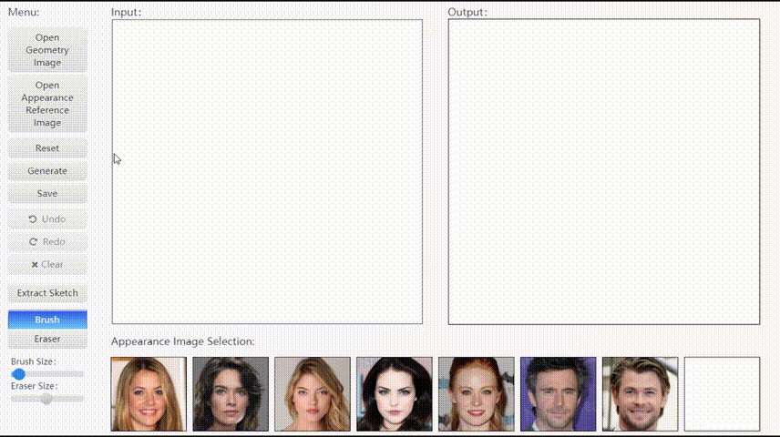 DeepFaceEditing可以从真实照片中提取草图,用户通过编辑草图,可以对人脸进行细节编辑。如图5界面中的(a),即为用户对图像提取到的草图编辑后的结果。(d)为外观参考图像列表,用户通过选取/加载外观参考图,实现人脸的肤色、发色等外观信息的编辑。控制菜单栏(c)中包含几何/参考图像加载,橡皮笔刷、控制笔触大小等功能。根据编辑的几何和选择的外观,最终合成的人脸编辑结果将实时展示在(b)上。