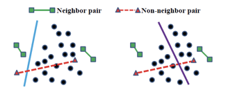 a、平衡性:即编码后的所有点的每一维度都有一半编码为0,一半编码为1。当编码达到平衡时,熵达到最大,信息量最大,哈希编码最好。如图1.4所示,左右两幅图的哈希方法都可以使带有标签的点对正确编码,但很明显右侧图哈希的空间分割有较大的熵,包含更大的信息量,因此比左侧图哈希好。