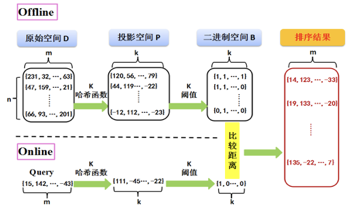 基于哈希的近似最近邻搜索过程主要分为两阶段:Offline和Online。图中虚线上面为Offline阶段,即对数据库中点进行与查询点无关的哈希编码。该过程可分为两步:首先使用 k 个哈希函数将原始空间 D 中 n 个 m 维的点映射到 k 维的投影空间 P 中,该映射要尽可能保持原始空间中点间的相似度关系。然后再使用 k 个阈值将投影空间中的点映射到二进制空间 B 中,即将其每一维度映射为“0”或“1”,阈值的选择要满足哈希特性(如平衡性);图中虚线下面为Online阶段,即对查询点哈希编码。对于查询点,我们使用与Offline阶段中同样的哈希函数与阈值,将 m 维查询点编码为 k 维二进制。最后,通过比较查询点二进制码和数据库中点二进制码之间的汉明距离即可将数据库中的点按照汉明距离由小到大排序。