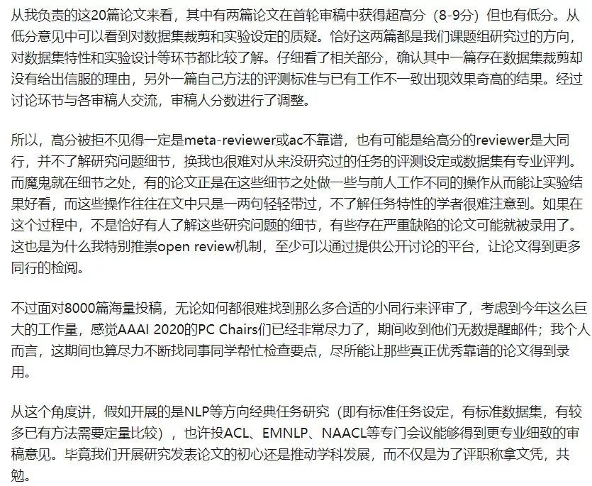 清华刘知远老师也是本次大会的SPC,昨日他在知乎也回复了大家有关审稿的相关质疑,在他看来审稿问题不能一概而论并表达了自己的观点,同时也给论文没中的同学指点迷津。