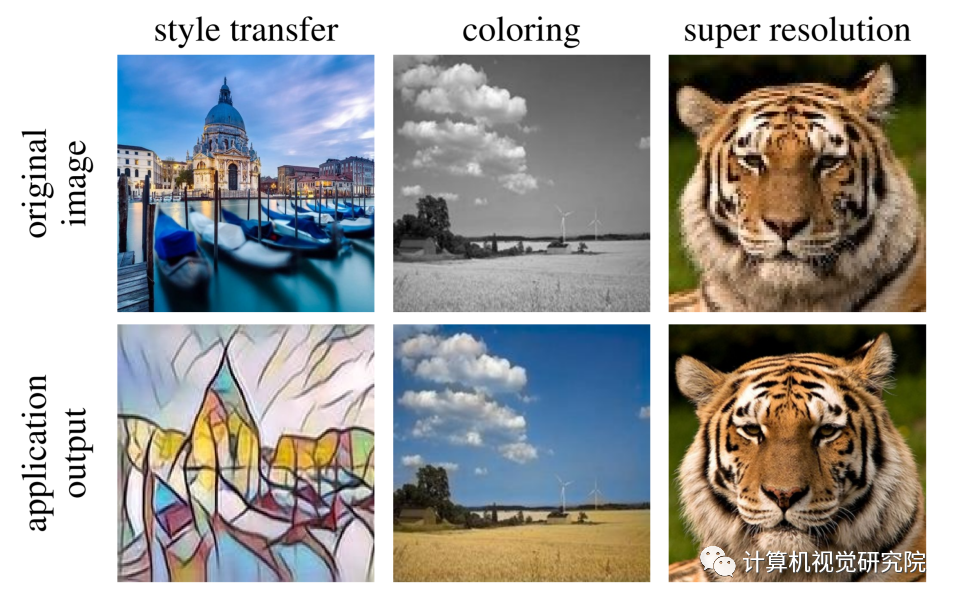 图10.基于模式化剪枝与通用型移动端推理框架在手机端的执行效果图。从左到右依次为,实时相机风格迁移、视频实时上色、相机超分辨率拍摄。