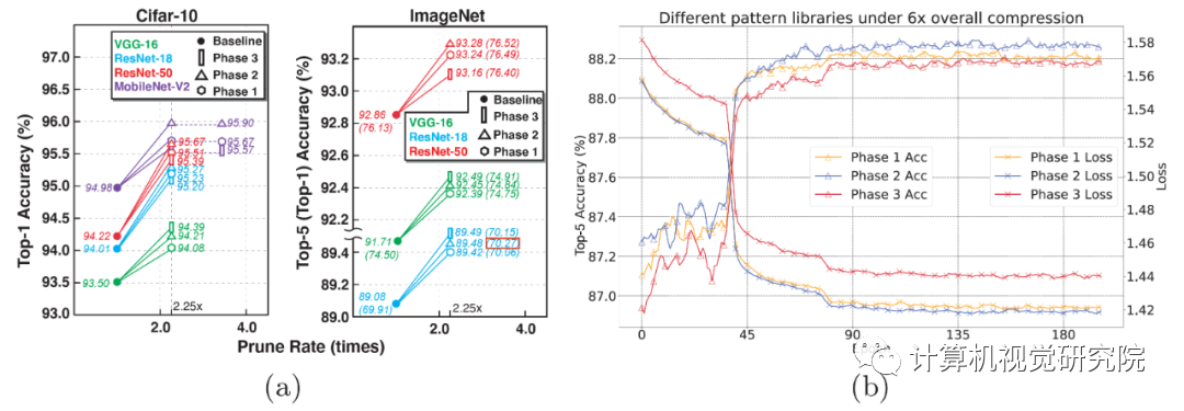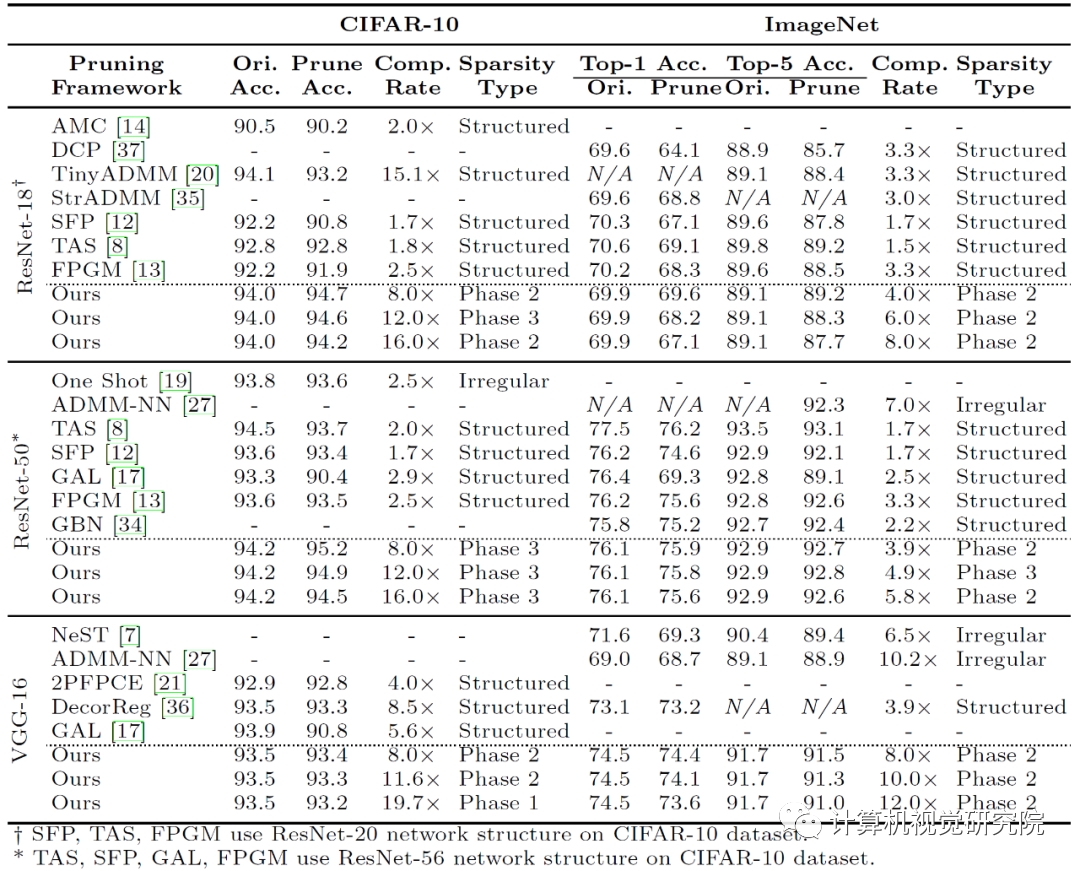 表 1. 基于模式化的剪枝在 CIFAR-10 与 ImageNet 数据集上的剪枝结果对比。