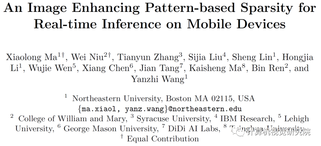 由美国东北大学王言治教授研究团队与美国威廉玛丽学院任彬教授研究团队共同提出,IBM、清华等共同研究的模式化稀疏度感知训练框架,不仅能够同时实现卷积核稀疏模式的全自动提取、模式化稀疏度的自动选择与模型训练,还证明了所提取的模式化稀疏度与理论最佳模式化稀疏度相匹配,并进一步设计了能够利用模型特点实现编译器优化的移动端推理框架,实现了大规模