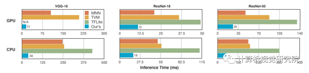我们同时可以观察到,卷积核与输出通道重排后的模型权重分布非常规则与紧凑,因此,在缓存与寄存器访问频率上的优化效果变得非常明显。规则与紧凑的数据意味着更低的数据访问频率,而数据访问频率降低意味着更低的内存开销。这一设计方法是可通用的,因此该研究提出的移动端推理框架可以大规模地部署在现有各种量产手机端,实现端上 AI 实时推理,满足用户需求。