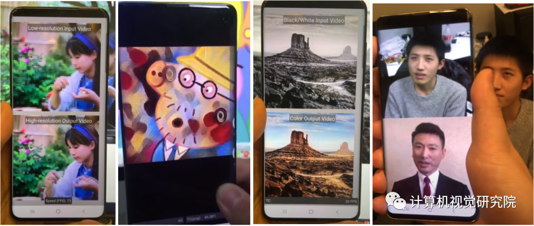 图9.基于模式化剪枝与通用型移动端推理框架在手机端不同AI应用场景的执行效果示意。从左到右依次为:相机超分辨率拍摄、实时相机风格迁移、视频实时上色、AI换脸。