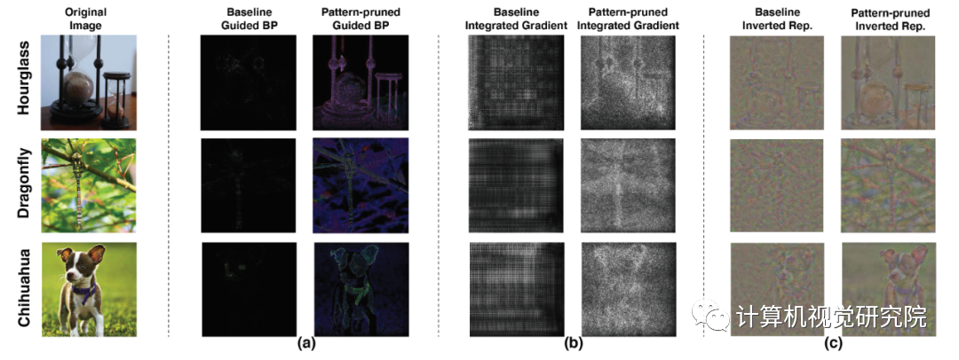 图 6. 基于 VGG-16 在 ImageNet 上剪枝后的模型可视化效果图。此处采用了三种不同的可视化方法:(a) guided-backpropagation (BP) ,(b) integrated gradients, (c) inverted representation。
