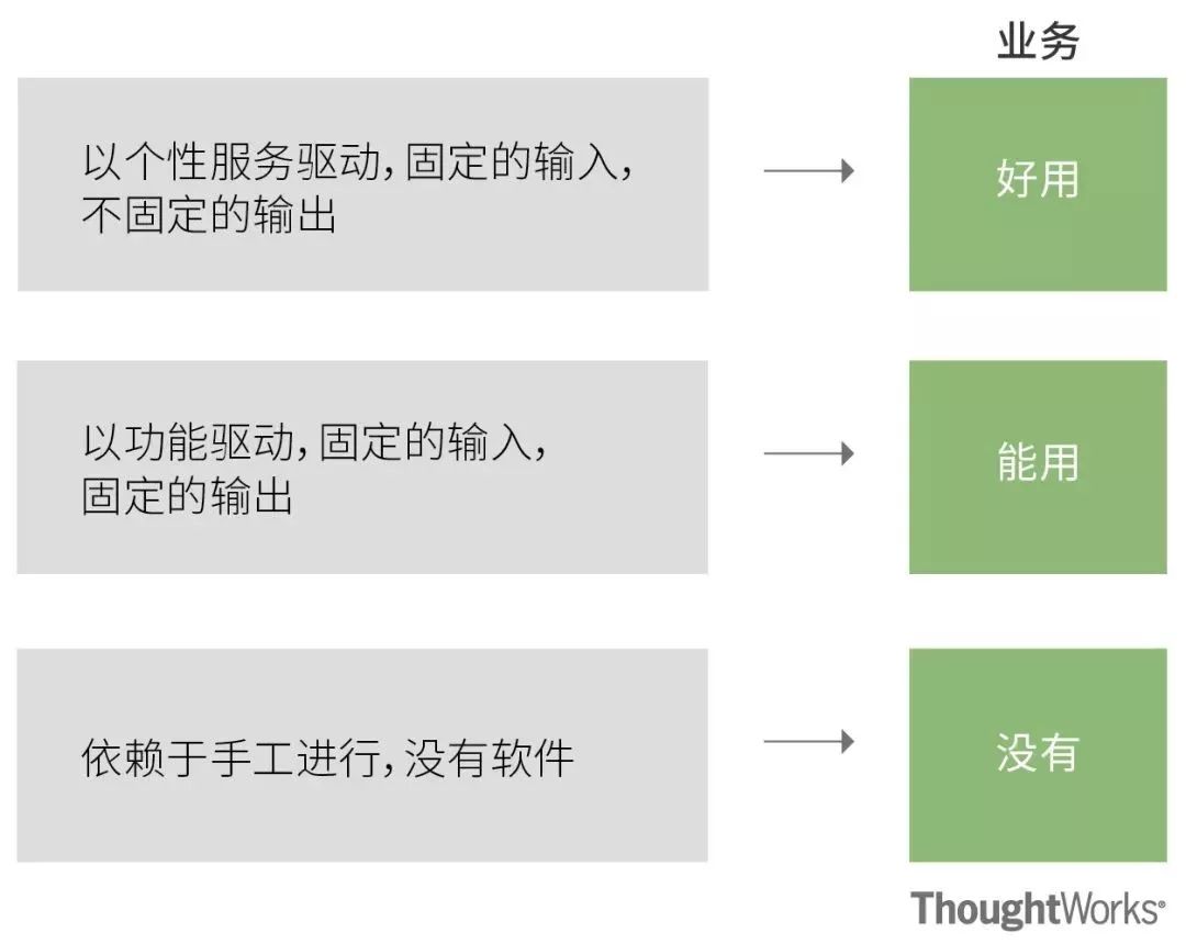 过去,数据依赖于手工进行,没有软件;有了数据中台,以功能驱动,固定的数据输入,得到固定的数据输出,构建出能用的服务变得更快速、更加的标准化,解决了业务侧的“能用”问题。但是,如何以固定的输入,以产生更灵活多变的输出,提供比如个性化的服务,做到“好用”,数据中台并没有给出答案。