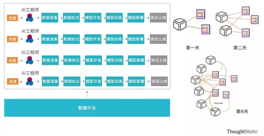 企业对数据的利用有三个阶段:响应运营,响应业务,创造业务。数据中台解决的是响应业务的问题,第三阶段“创造业务”,则需要AI中台。