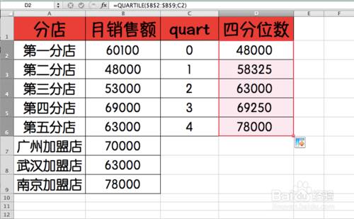 计算四分位数,比如1~100的数字中,25分位就是按从小到大排列,在25%位置的数字,即25。参数0代表最小值,参数4代表最大值,1~3对应25、50(中位数)、75分位