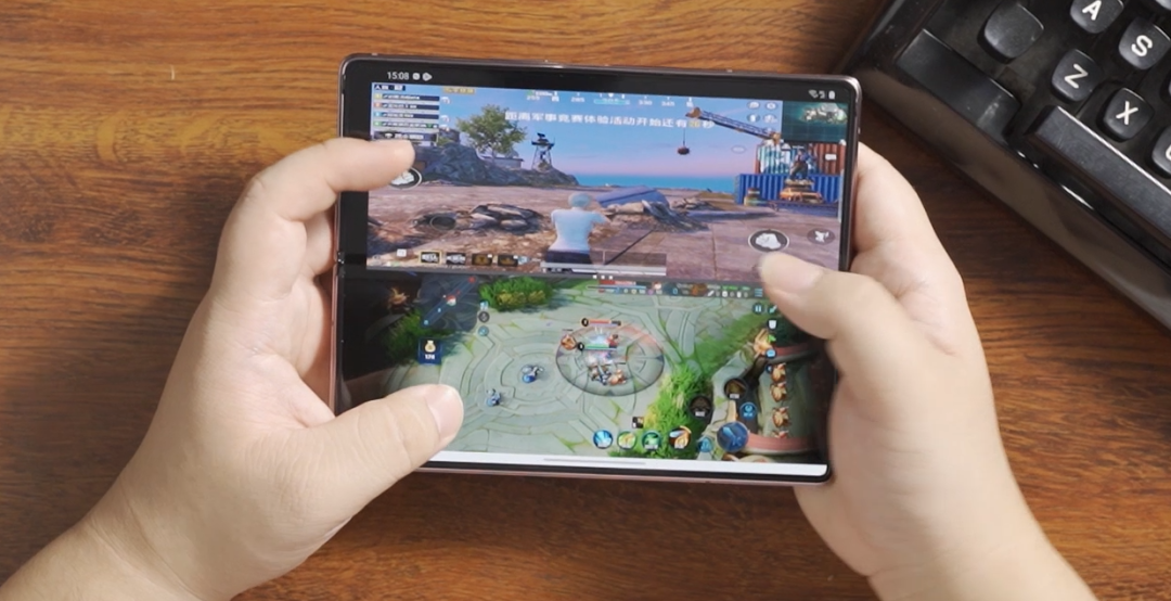 而且得益于这次的硬件配置都是旗舰级水准,所以主屏甚至可以同时开启两个大型游戏,我们尝试过用这块7.6英寸的大屏幕,上屏吃鸡,下屏王者荣耀,不过对于我们这些只有两只手的地球人来说,想要兼顾两个游戏确实有点难,但是如果想一边看大神的视频,一边自己在游戏里实操,还是靠谱的。大屏带来的效率提升,不言而喻。