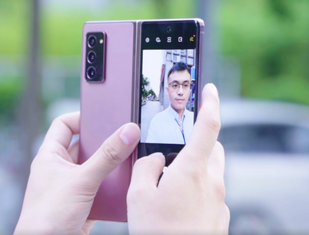 在交互方面,也比上一代产品更加完善。因为铰链可以悬停,所以当你把它立在桌子上,不管是视频通话还是拍摄,都有完全不一样的体验,比如把它放在桌上,人在桌前做出拍照的手势,也是一种趣味;对于副屏的拍照预览来说,不管是后置摄像头自拍,还是多人合照的他拍,都能够通过这块副屏做到实时的反馈,让自拍和他拍从此不再担心效果不够好。
