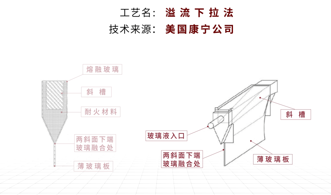 溢流下拉法由美国康宁公司首次提出,原理就是将熔化的玻璃液注入溢流槽内,随着玻璃液溢出到两侧后,在溢流槽下面汇合成连续的玻璃带,然后下拉、退火,生产出玻璃。