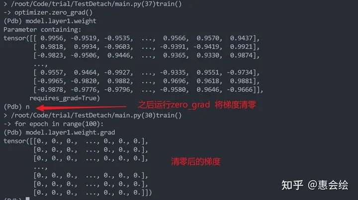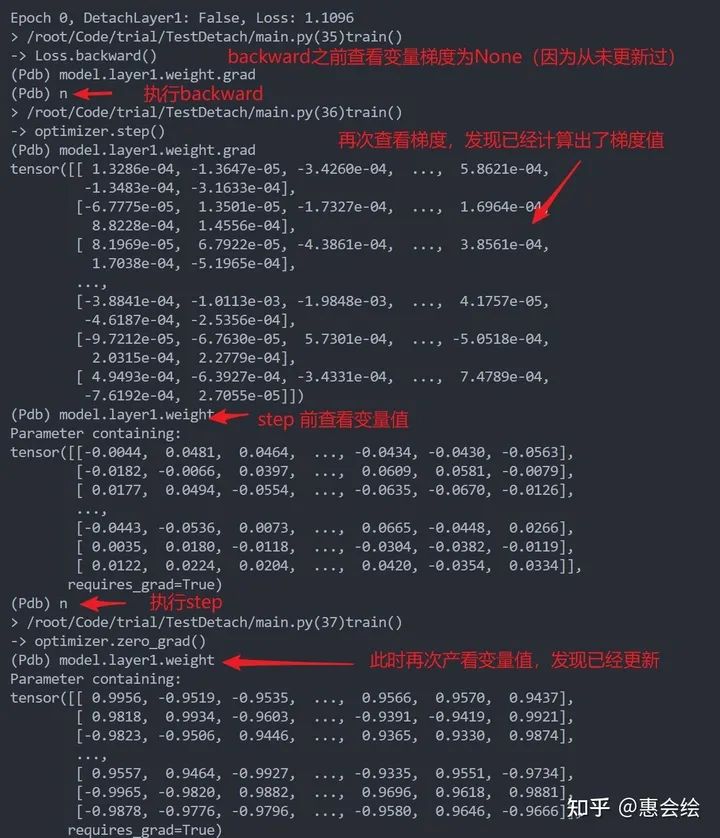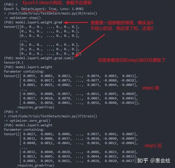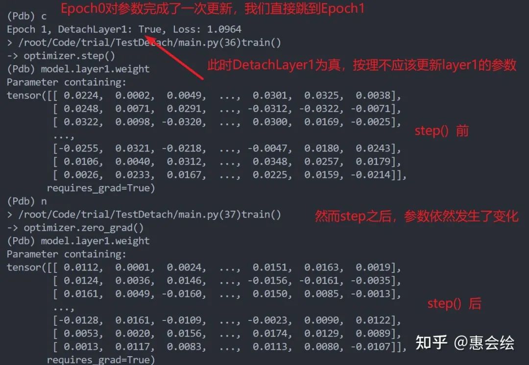 如果你亲自单步调试的话,会发现第一层的参数再一直变化,并没有被固定住,就像是detach没有起到作用一样。进一步观察第一层变量的梯度的话,你会发现梯度确实也是0,但是参数确实也在更新:
