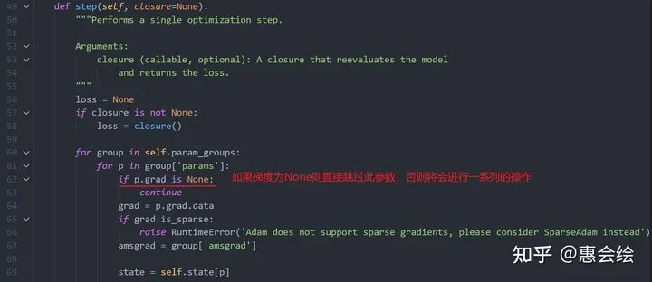 值得一提的是:上面zero_grad将梯度清零,而不是置为之前的None。然后,我们跳转到step的实现部分,注意观察第62行: