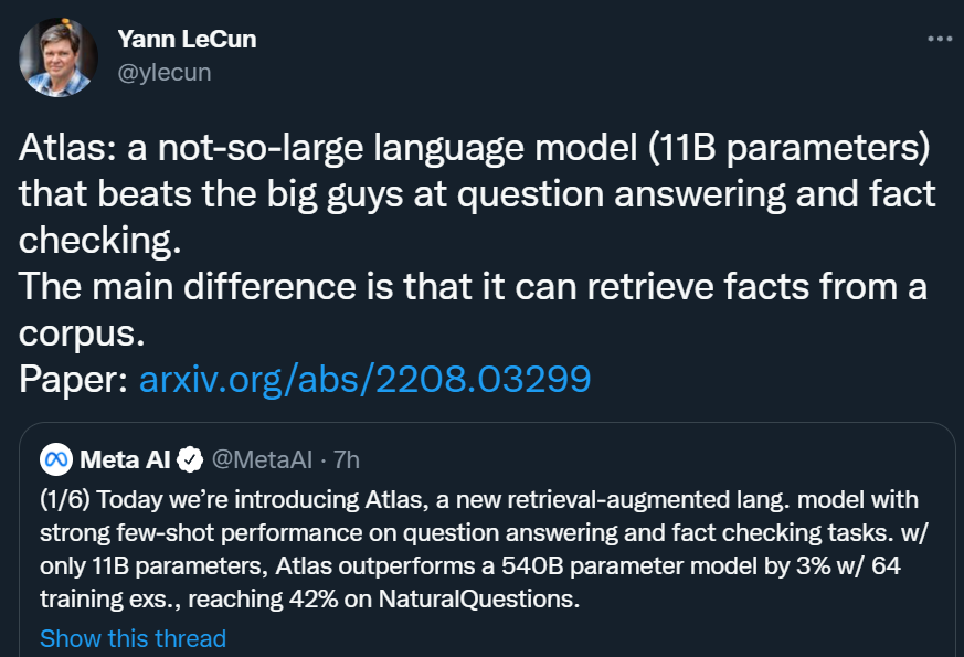 Yann LeCun 表示:Atlas 是一个不太大的语言模型,具有 110 亿参数,在问答和事实核查方面击败了「大家伙」。