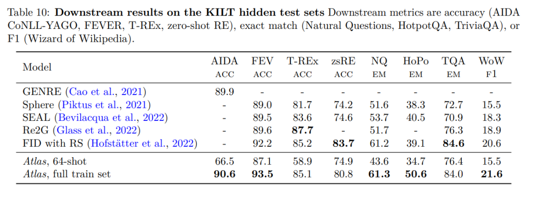 为验证 Atlas 的性能,Atlas 在 KILT 进行了评估,KILT 是由几个不同的知识密集型任务组成的基准。下表展示了测试集的结果。