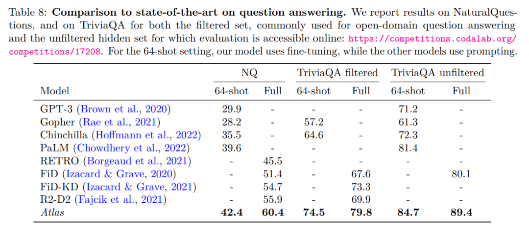 在只有 11B 个参数的情况下,Atlas 使用 64 个训练示例在 NaturalQuestions(NQ)上实现了 42.4% 准确率,比 540B 参数模型 PaLM( 39.6% ) 高出近 3 个百分点,在全数据集设置中(Full)达到 64.0% 准确率。