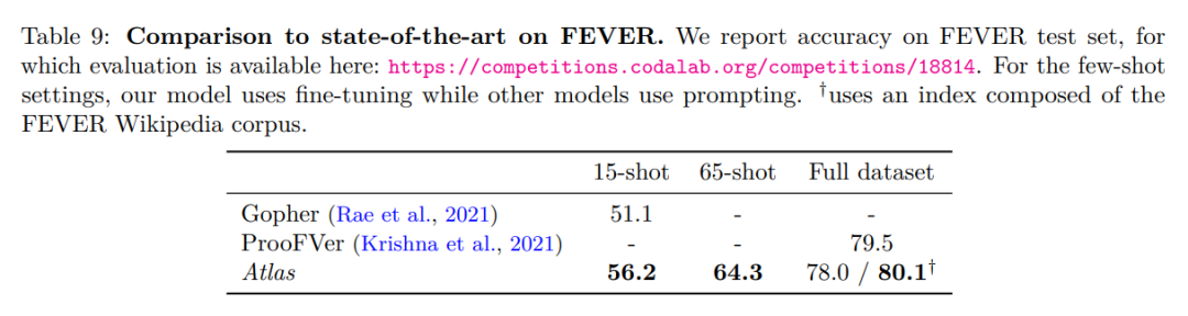 Atlas 在 64-shot 情况下,训练样例采样自全量训练集。Atlas 达到了 64.3% 的准确率。而在 15-shot 的情况下,从每个类中统一采样 5 个样例,与 Gopher 结果比较,Atlas 准确率为 56.2%,比 Gopher 高 5.1 个百分点。在全量训练集上微调 Atlas 模型,达到 78% 的准确率,比 ProoFVer 低 1.5%。ProoFVer 使用专门的架构,用句子级注释训练的检索器,并由维基百科语料库提供与 FEVER 一起发布,而 Atlas 从 CCNet 和 2021 年 12 月的维基百科转储中检索。当给 Atlas 由 FEVER Wikipedia 语料库组成的索引,Atlas 取得了 80.1% 最优水平。