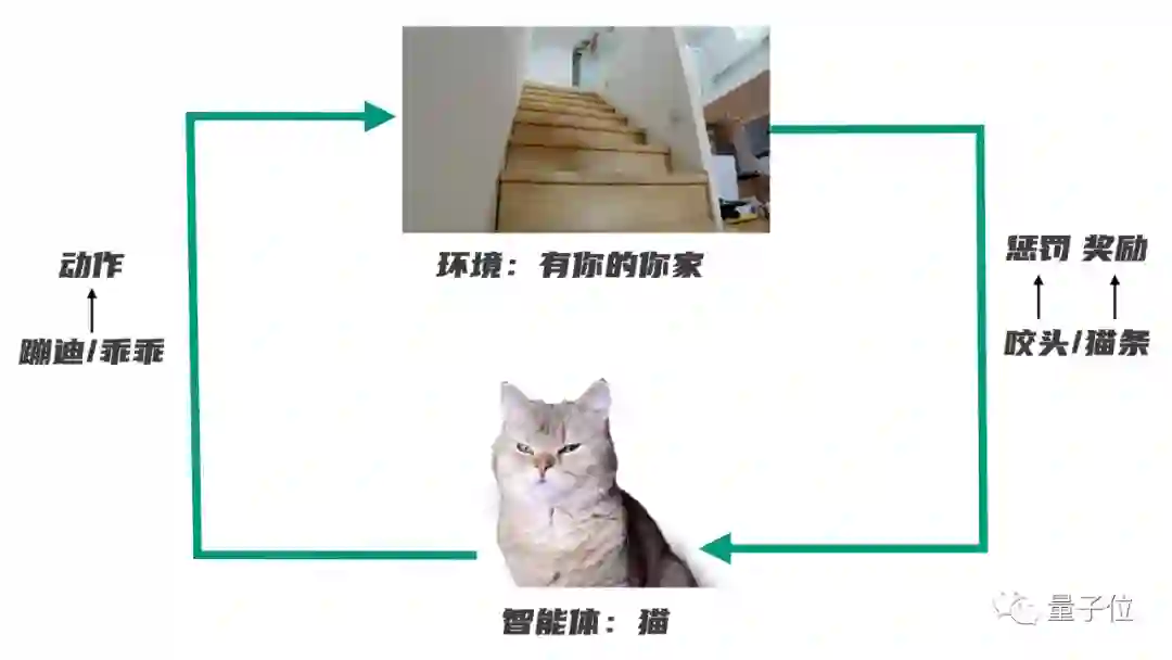 一个智能体(你的猫)在与环境(有你的你家)互动的过程中,在奖励(猫条)和惩罚(咬头)机制的刺激下,逐渐学会了一套能够最大化自身收益的行为模式(安静,躺平)。