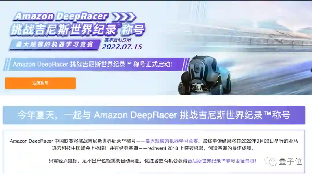 与之同时,亚马逊云科技官方还在搞一个“挑战吉尼斯世界纪录”的活动,目标是突破4387这个参赛人数数字,申请成为全世界“最大规模的机器学习竞赛”。