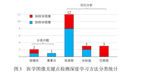 医学图像关键点检测深度学习的方法广泛采用监 督学习的方式,即利用一组关键点标注数据样本训练 与调整深度学习网络的参数,使其达到所要求分类或 者回归性能的过程 . 根据学习问题的类型可以将现有 的医学图像关键点检测深度学习方法划分为两大类: 一类利用像素点分类方式解决,另一类则是关键点坐 标回归的方法 . 图 3 统计了这两类方法的研究论文数 量,其中采用分类框架的方法远低于基于回归分析的 研究,针对每一类方法的类型细分将在后续研究现状 分析中给出更为详细的梳理与讨论.