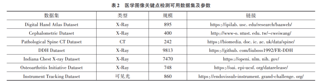利用深度学习进行医学图像关键点检测时,获取 大规模的学习训练样本数据集非常困难,且需要临床 专家标注,因此目前公开可用的医学图像关键点检测 数据集偏少,为了解决数据集的限制,可以从两个方面 尝试解决大规模的医学数据标注样本数据的问题. 一方面,医学图像领域的挑战赛及大型公开数据 集的出现对医学图像分析的发展有着极大的帮助,自 2007年以来,MICCAI、ISBI 和 SPIE 等医学成像研讨会 组织挑战赛数据集已经成为惯例,开放了大量用于基 准研究的医学数据集[56] ,收录在网站http://www. grandchallenge. org/. 另外通过追踪相关研究文献中研究者 们给出的数据集,表2给出本文整理的可用于医学图像 关键点检测的图像库及其链接.