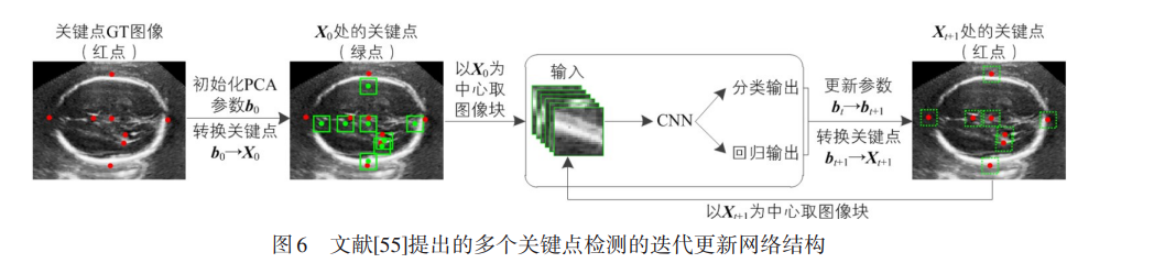 深度学习方法有效促进了不同尺度和不同任务信 息之间的融合,使得信息的结合方式由平面开始向立 体方法发展,对于医学图像关键点检测模型的发展具 有突出的实际意义. 正因为如此,本文对医学图像关键 点检测的深度学习方法进行了梳理和综述 . 从本文筛 选出的在此研究领域具有特别贡献的论文研究成果可 知,研究者们结合各自的医学应用需求开展的特定医 学图像上的关键点深度学习检测算法中,大多有意识 地去解决医学标注数据少、医学图像数据量大对 CNN 网络带来的训练与预测中的问题,并取得了良好的检 测与定位性能(需要注意的是,由于各自任务目标、数 据等不具有统一对比性,这里并未给出关键点定位精 度的统计). 尽管已经取得了良好的检测效果,但进一步提高 医学解剖关键点的检测精度并将实现研究成果的临床 应用还有较长的路要走 . 本文作者结合自身在这个领 域的研究经验对其存在的关键难题和开放的研究方向 给出一些思考和讨论:①医学图像关键点个体间差异 性和个体内歧义性的固有特征无法回避,在这种情 况下要实现高精度医学关键点检测,就需要建立一 个充分挖掘医学图像关键点信息并能够综合应用信 息的最优深度学习网络框架,同时考虑可用的小规 模医学图像数据集对网络规模的限制;②深度学习 只是解决问题的一种方法,同样存在各种各样的局 限性,在很好地把握深度学习方法优劣势的基础上, 能够结合几十年累积起来的经典的图像处理方法和 思路不失为明智的选择,同时还要关注能对医学图 像关键点检测带来启发的其他计算机视觉、机器学习 领域的新成果.