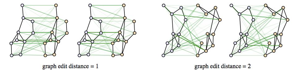 图 G1 和 G2 之间的图编辑距离即将 G1 变换为 G2 所需的最小编辑操作。通常这些编辑操作包括添加/移除/替换节点和边。图编辑距离是衡量图之间相似性的自然指标,在图相似性搜索中有很多应用。
