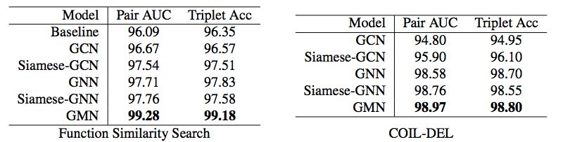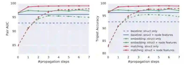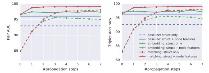 实验证明,该研究提出的图相似性学习模型 GMN 在多个应用中都有良好的表现,比结构不可知模型和现有的手动建立的基线模型都要好。