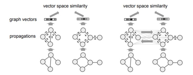 图匹配网络以一对图作为输入,计算它们之间的相似性分数。和嵌入模型相比,图匹配模型联合成对图计算相似性分数,而不是先将每个图独立地映射到向量上。因此,图匹配模型可能比嵌入模型更加强大,但它需要额外的计算效率。