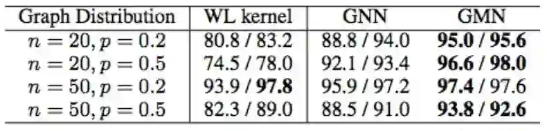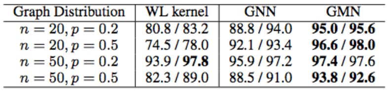 表 1:在来自不同分布的图上训练的图嵌入(GNN)模型和图匹配(GMN)模型和基线的比较,衡量指标为pair AUC / triplet accuracy (×100)。
