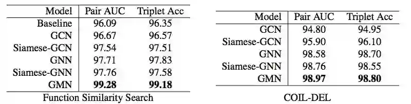 研究者检测了GMN 模型中不同组件的效果,并将 GMN 模型与图卷积网络(GCN)、图神经网络(GNN)和 GNN/GCN 嵌入模型的 Siamese 版本进行对比。