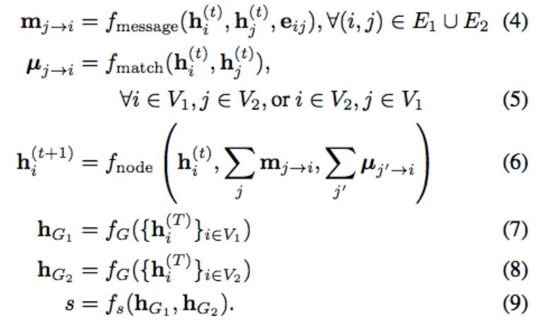 图匹配网络改变了每个传播层中的节点更新模块,这样不仅可以考虑到每个图的边上的聚合信息,还可以考虑到衡量一个图中的一个节点和其他图中的一或多个节点匹配程度的跨图匹配向量: