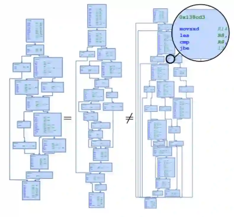 图 1:二元函数相似性学习问题。检查两个图是否相似需要推理图的结构和语义。左边两个控制流图对应使用不同编译器编译的相同函数(因此二者比较相似),但右侧图对应的是不同函数。