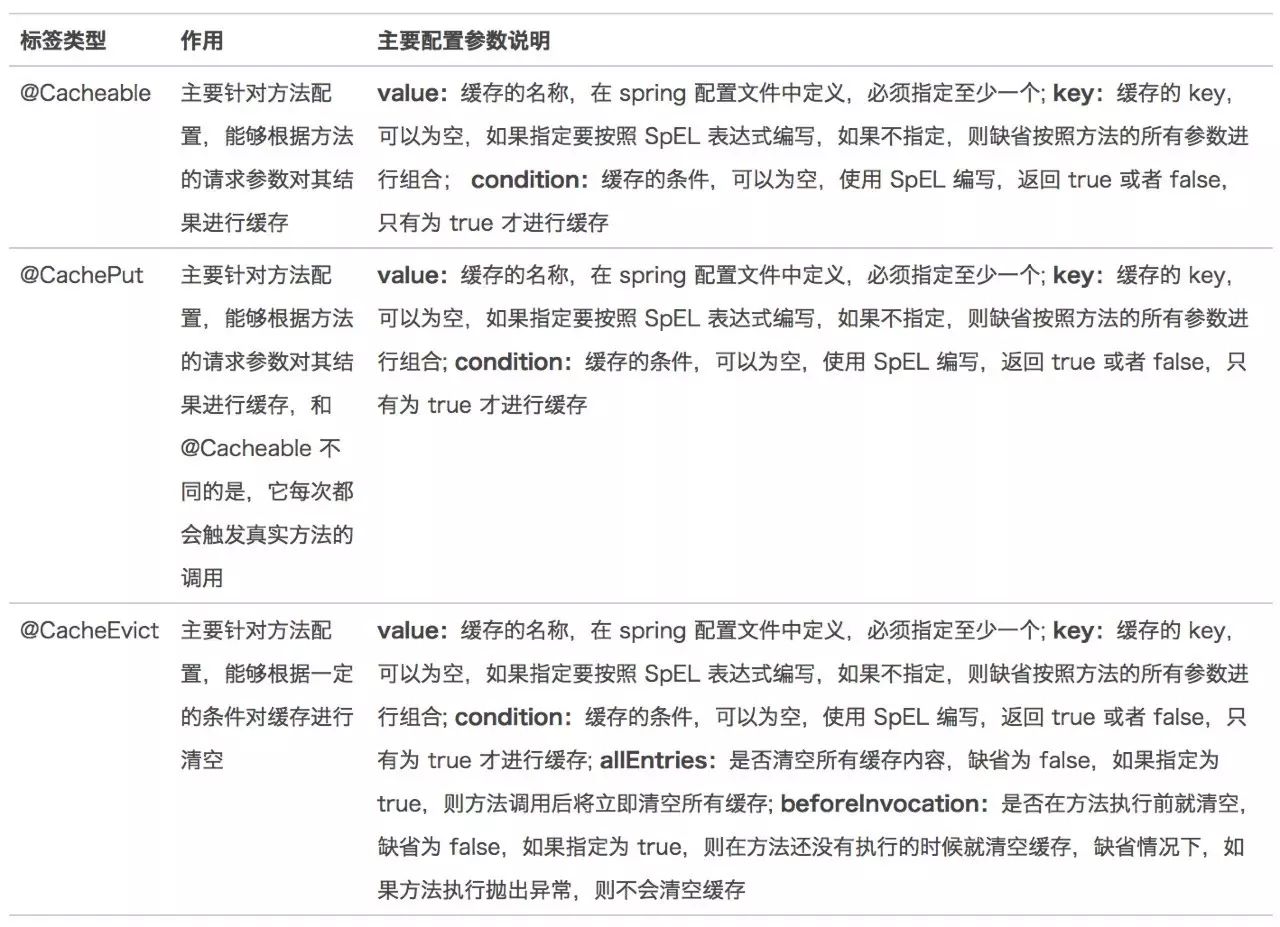 如图12所示,实际客户端获取的是一个代理的引用,在调用foo()方法的时候,会首先调用proxy的foo()方法,这个时候proxy可以整体控制实际的pojo.foo()方法的入参和返回值,比如缓存结果,比如直接略过执行实际的foo()方法等,都是可以轻松做到的。Spring Cache主要使用三个注释标签,即@Cacheable、@CachePut和@CacheEvict,主要针对方法上注解使用,部分场景也可以直接类上注解使用,当在类上使用时,该类所有方法都将受影响。我们总结一下其作用和配置方法,如表1所示。
