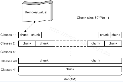 虽然在同一个slab中chunk的大小相等的,但是在不同的slab中chunk的大小并不一定相等,在memcached中按照chunk的大小不同,可以把slab分为很多种类(class),默认情况下memcached把slab分为40类(class1~class40),在class 1中,chunk的大小为80字节,由于一个slab的大小是固定的1048576字节(1M),因此在class1中最多可以有13107个chunk(也就是这个slab能存最多13107个小于80字节的key-value数据)。