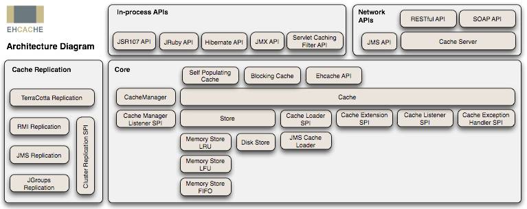 在上层可以看到,整个Ehcache提供了对JSR、JMX等的标准支持,能够较好的兼容和移植,同时对各类对象有较完善的监控管理机制。它的缓存介质涵盖堆内存(heap)、堆外内存(BigMemory商用版本支持)和磁盘,各介质可独立设置属性和策略。Ehcache最初是独立的本地缓存框架组件,在后期的发展中,结合Terracotta服务阵列模型,可以支持分布式缓存集群,主要有RMI、JGroups、JMS和Cache Server等传播方式进行节点间通信,如图3的左侧部分描述。