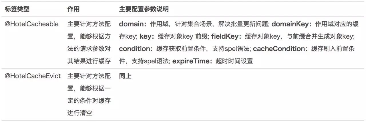 主要使用两个标签,即@HotelCacheable、@HotelCacheEvict,其作用和配置方法见表2。