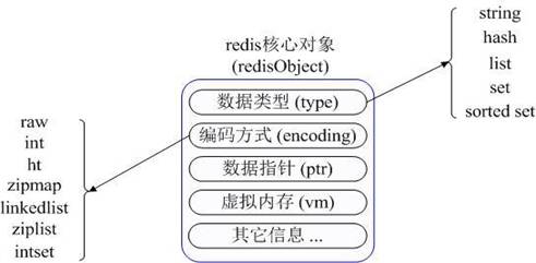 图9左边的raw列为对象的编码方式:字符串可以被编码为raw(一般字符串)或Rint(为了节约内存,Redis会将字符串表示的64位有符号整数编码为整数来进行储存);列表可以被编码为ziplist或linkedlist,ziplist是为节约大小较小的列表空间而作的特殊表示;集合可以被编码为intset或者hashtable,intset是只储存数字的小集合的特殊表示;hash表可以编码为zipmap或者hashtable,zipmap是小hash表的特殊表示;有序集合可以被编码为ziplist或者skiplist格式,ziplist用于表示小的有序集合,而skiplist则用于表示任何大小的有序集合。