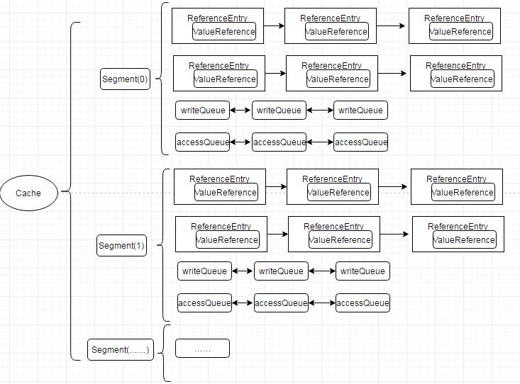 ReferenceEntry是对一个键值对节点的抽象,它包含了key和值的ValueReference抽象类,Cache由多个Segment组成,而每个Segment包含一个ReferenceEntry数组,每个ReferenceEntry数组项都是一条ReferenceEntry链,且一个ReferenceEntry包含key、hash、valueReference、next字段。除了在ReferenceEntry数组项中组成的链,在一个Segment中,所有ReferenceEntry还组成access链(accessQueue)和write链(writeQueue)(后面会介绍链的作用)。ReferenceEntry可以是强引用类型的key,也可以WeakReference类型的key,为了减少内存使用量,还可以根据是否配置了expireAfterWrite、expireAfterAccess、maximumSize来决定是否需要write链和access链确定要创建的具体Reference:StrongEntry、StrongWriteEntry、StrongAccessEntry、StrongWriteAccessEntry等。