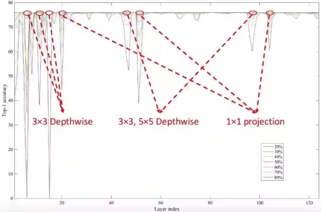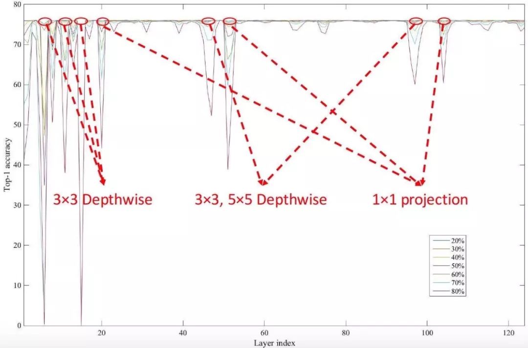 在确定好模型之后,先对网络进行剪枝,去掉不重要的参数量和计算。在这之前,对每一层进行了鲁棒性分析。具体而言,对于每一层,团队进行稀疏度从0.1到0.9的剪枝,然后测试网络精度。图1显示了网络各层对不同稀疏度的影响,可以看出某几层对网络剪枝特别敏感,而其余一些层对剪枝却很鲁棒。基于此,确定了每一层的稀疏度,然后删除不重要的节点,再对剩余连接进行重新训练。可以实现在稀疏度大概为60%的情况下,精度损失只有0.4%。