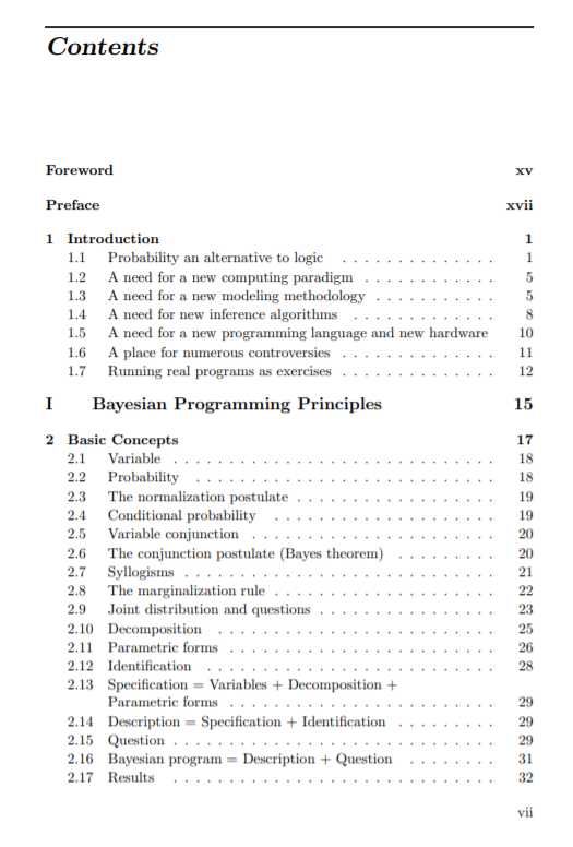 第四部分连同词汇表包含了常见问题的答案。作者比较了贝叶斯规划和可能性理论,讨论了贝叶斯推理的计算复杂性,讨论了不完全性的不可约性,讨论了概率的主观主义和客观主义认识论。